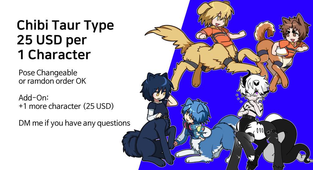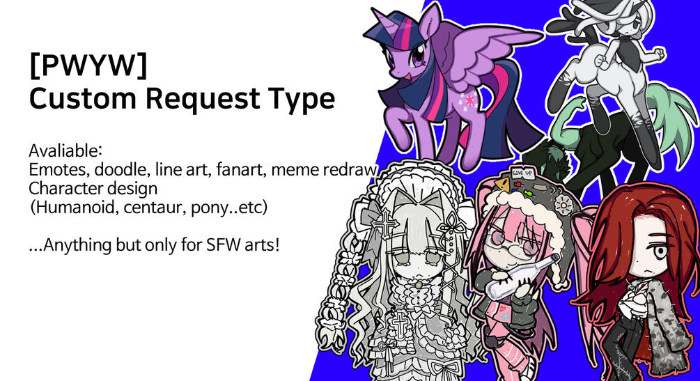 Do: Humanoid, flat face furry, centaur (including furtaur), pony, fanart, OC, yumeship, doodle, pfp, banner, emotes...Anything you want except ⬇️Don't: Mech, NSFW, Background art, elderly character, realism, hateful drawings, detailed muscles, pornography featuring minors.Requests for commissions beyond my capacity may be denied.